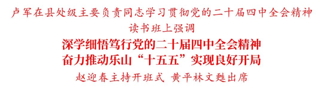 1月30日至2月3日,县处级主要负责同志学习贯彻党的二十届四中全会精神读书班在市委党校举行,市委书记卢军出席开班式并作主题报告。他强调,要深入学习贯彻习近平总书记在省部级主要领导干部学习贯彻党的二十届四中全会精神专题研讨班开班式上发表的重要讲话精神,深学细悟笃行党的二十届四中全会精神,认真落实省委十二届八次全会和市厅级主要负责同志学习贯彻党的二十届四中全会精神读书班要求,按照市委八届十二次全会部署安排,锚定目标、坚定信心、真抓实干,奋力推动乐山“十五五”实现良好开局。